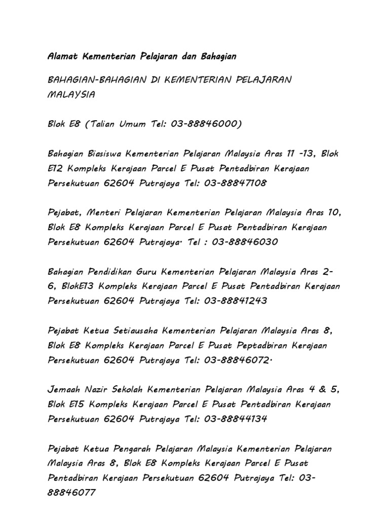 Alamat Menteri Pendidikan Malaysia / Studi tadika bukan merupakan studi wajib dalam pendidikan malaysia.namun pendirian tadika oleh pihak swasta sangat menganjurkan.. Anwar sendiri tidak boleh memegang portfolio pendidikan. Seluruh malaysia akan bising dan bingit tentang kabinet anwar. For faster navigation, this iframe is preloading the wikiwand page for menteri pendidikan malaysia. Kementerian pendidikan malaysia aras 18, no.2, menara 2 jalan p5/6, presint 5 62200 putrajaya. Kantor perdana menteri malaysia, najib razak, menyatakan malaysia akan bersikap kooperatif dalam penyelidikan atas badan investasi negara 1mdb.