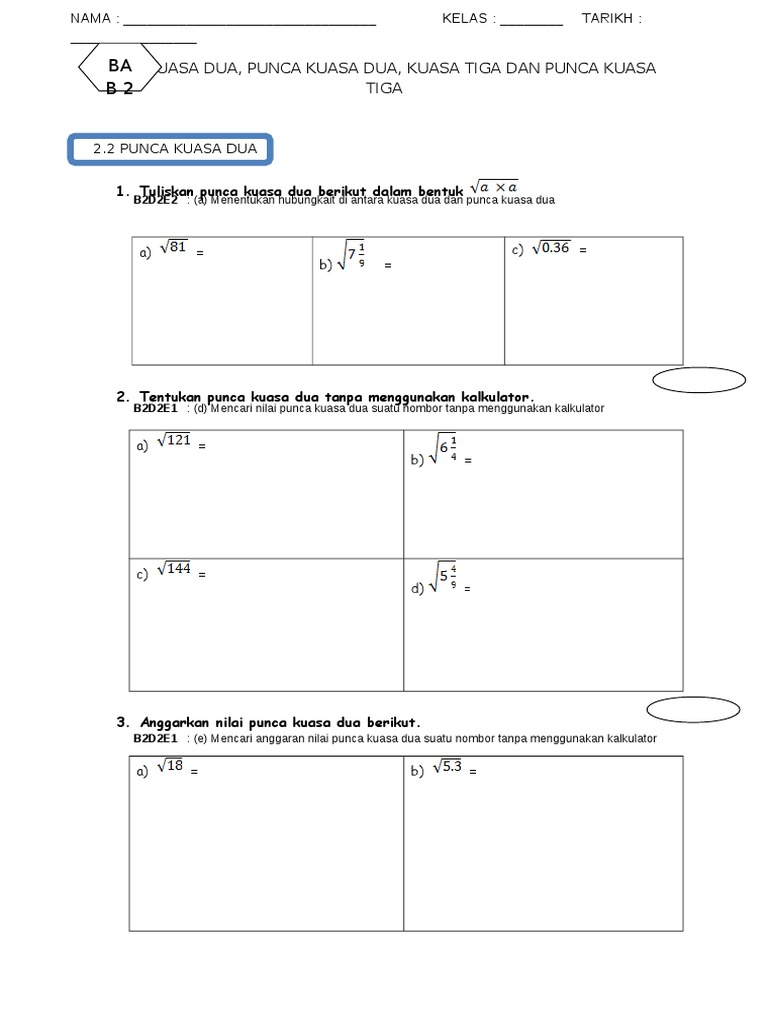 Kuasa Dua In English from rir.ultrasonicoindiferente.pw Kira isi padu, dalam m3, sebuah kubus jika luas perimeter segi empat sama itu. Punca kuasa dua suatu nombor positif ialah suatu nombor yang apabila didarabkan dengan dirinya sendiri akan menghasilkan nombor positif itu. Check 'punca kuasa dua' translations into english. Select the proper units for your inputs and the units you want to get the calculated unknowns in and press solve. T1c3 tingkatan 1 kuasa dua. Apa ungkapan yang boleh mewakili umur joey dalam 5 tahun dan apa ungkapan mewakili usia martina dalam 5 tahun? What does punca kuasa dua mean in malay? Menyatakan punca kuasa dua suatu nombor positif sebagai suatu nombor yang didarab dengan nombor yang sama menghasilkan nombor positif tersebut 1.